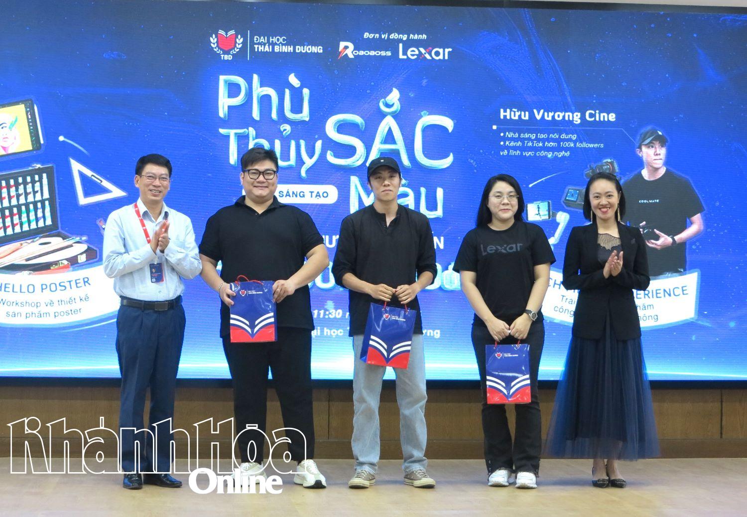 | Đại diện nhà trường tặng quà lưu niệm cho các khách mời và đại diện nhãn hàng đồng hành với chương trình. |