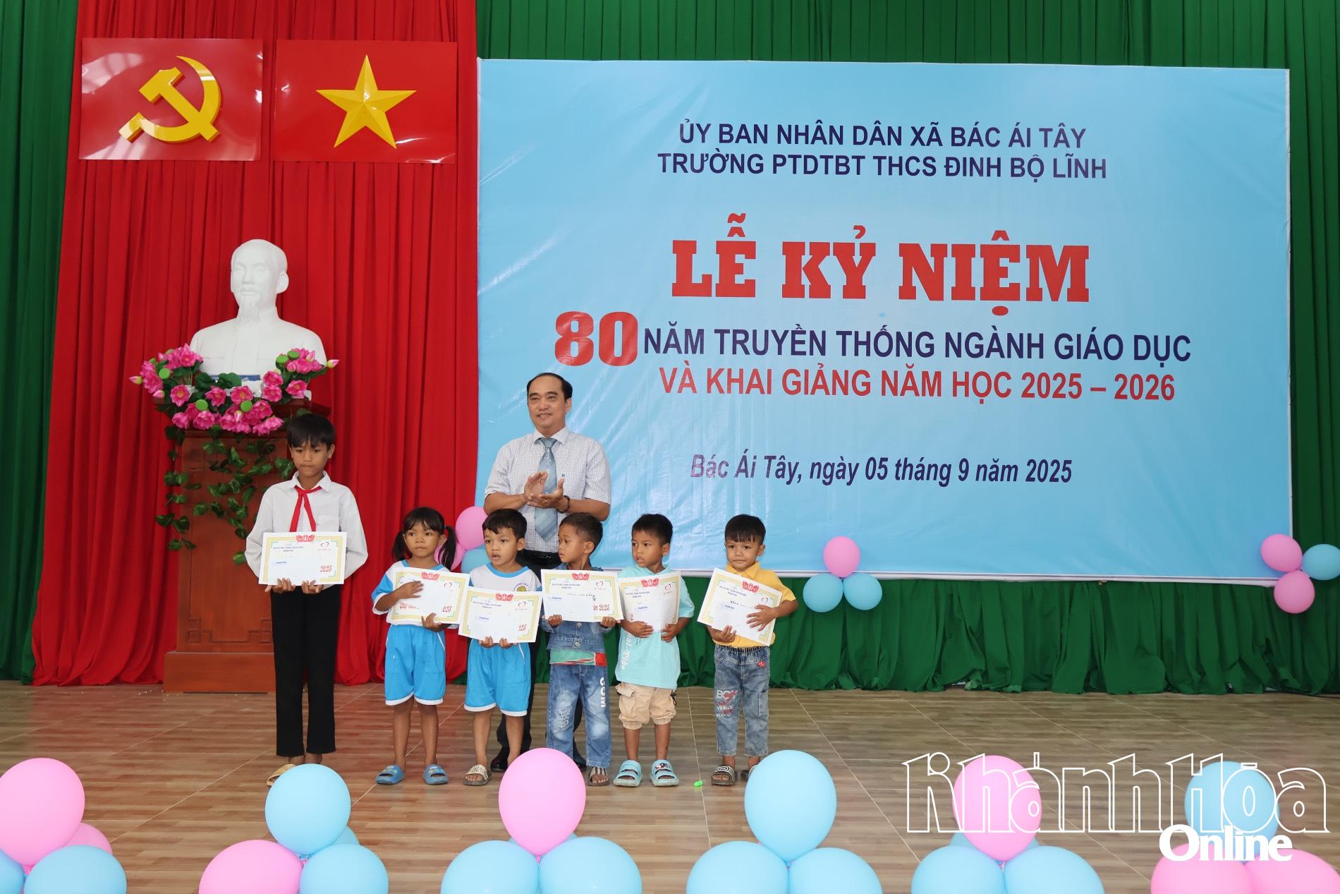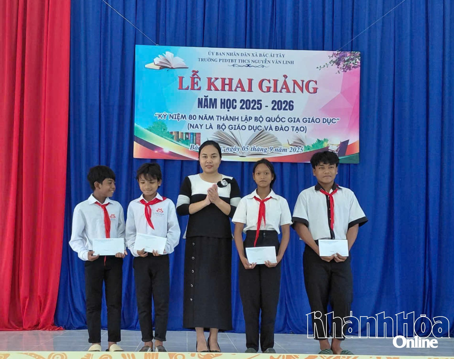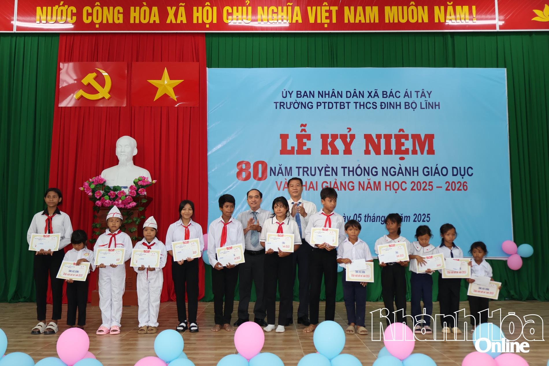| Đồng chí Võ Đình Vinh - Bí thư Đảng ủy, Chủ tịch HĐND xã Bác Ái Tây và đồng chí Nguyễn Xuân Duy - Phó Tổng Biên tập Báo và Phát thanh, Truyền hình Khánh Hòa trao học bổng cho học sinh Trường Phổ thông Dân tộc bán trú THCS Đinh Bộ Lĩnh. |