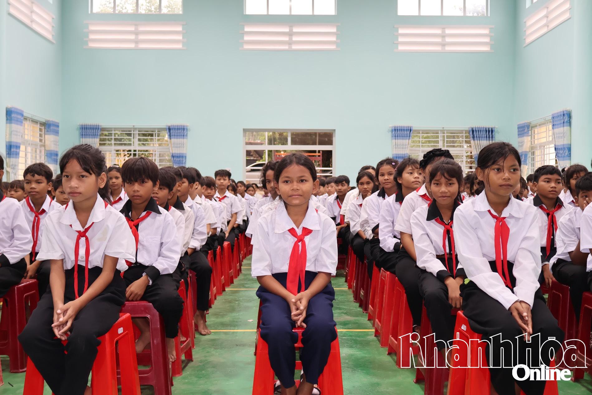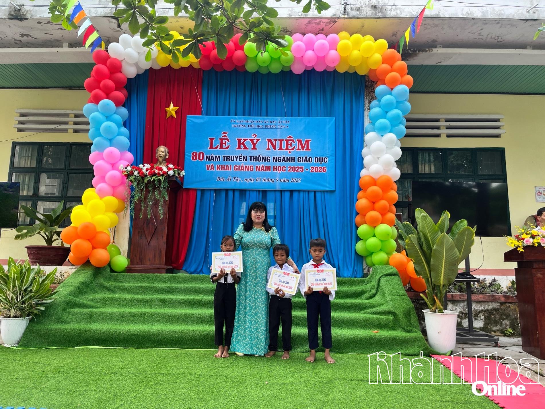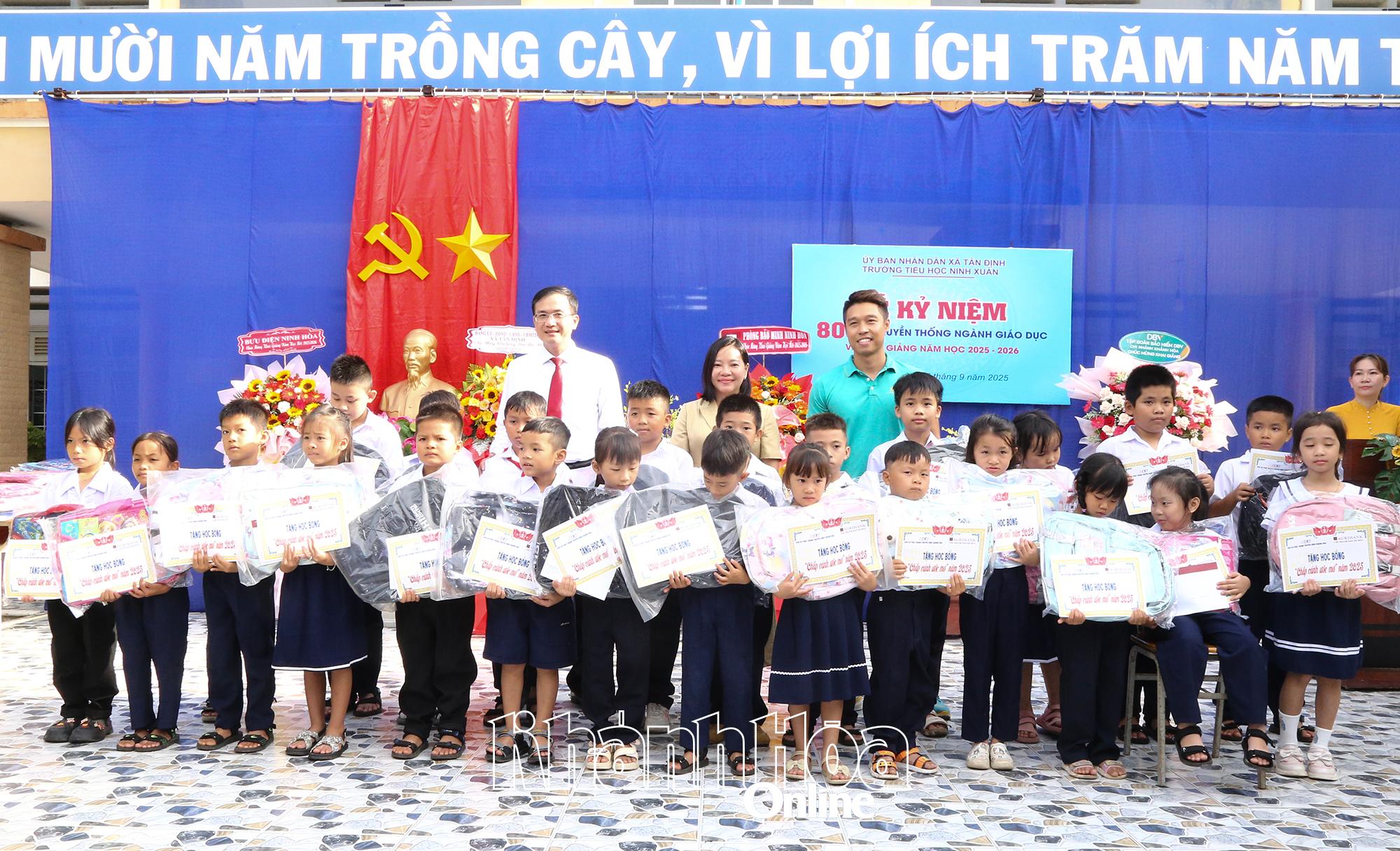 Dịp này, lãnh đạo các đơn vị đã trao 50 suất học bổng, mỗi suất trị giá 500.000 đồng (tổng trị giá 25 triệu đồng do Ngân hàng Nông nghiệp và Phát triển nông thôn Chi nhánh Khánh Hòa tài trợ) và 50 chiếc cặp học sinh (tổng trị giá 10 triệu đồng do Công ty Cổ phần Đầu tư và Phát triển XGROUP tài trợ) cho 50 học sinh có hoàn cảnh đặc biệt khó khăn; 33 suất học bổng, mỗi suất trị giá 500.000 đồng (tổng trị giá 16,5 triệu đồng do Doanh nghiệp tư nhân Thanh Hải tài trợ) cho 33 học sinh có hoàn cảnh khó khăn của trường.