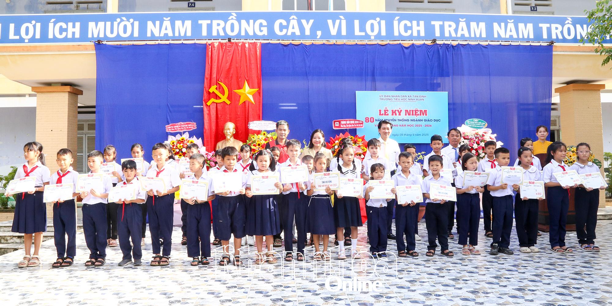 * Đồng chí Thái Thị Lệ Hằng - Bí thư Đảng ủy, Tổng Biên tập Báo và Phát thanh, Truyền hình Khánh Hòa; lãnh đạo Đảng ủy, UBND xã Tân Định và lãnh đạo các đơn vị: Tổng Công ty Khánh Việt, Ngân hàng Nông nghiệp và Phát triển nông thôn Chi nhánh Khánh Hòa, Công ty Cổ phần Đầu tư và Phát triển XGROUP, Doanh nghiệp tư nhân Thanh Hải dự lễ khai giảng năm học 2025 - 2026 và trao quà, học bổng cho học sinh Trường Tiểu học Ninh Xuân (xã Tân Định).