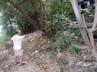 | Ông Chính chỉ vào nơi một nửa căn nhà của mình bị sụp xuống sông. |