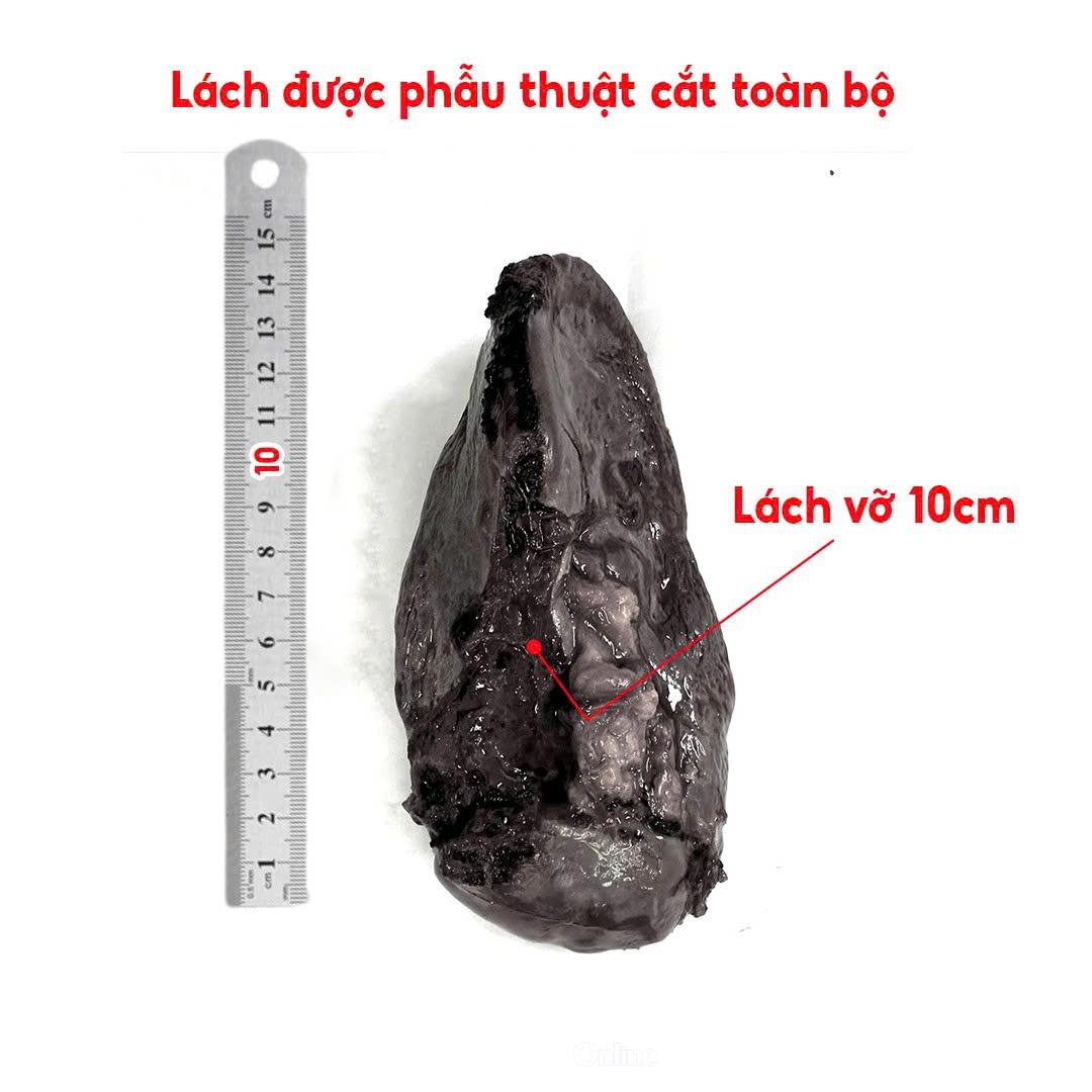 Trong quá trình phẫu thuật, các bác sĩ ghi nhận lách vỡ phức tạp ở vùng cực dưới với đường rách hình sao dài khoảng 8 - 10cm, máu chảy ồ ạt trong ổ bụng. Ê-kíp quyết định cắt toàn bộ lách để cầm máu, đồng thời truyền 5 đơn vị máu và 6 đơn vị huyết tương tươi nhằm bù lại lượng máu đã mất.
