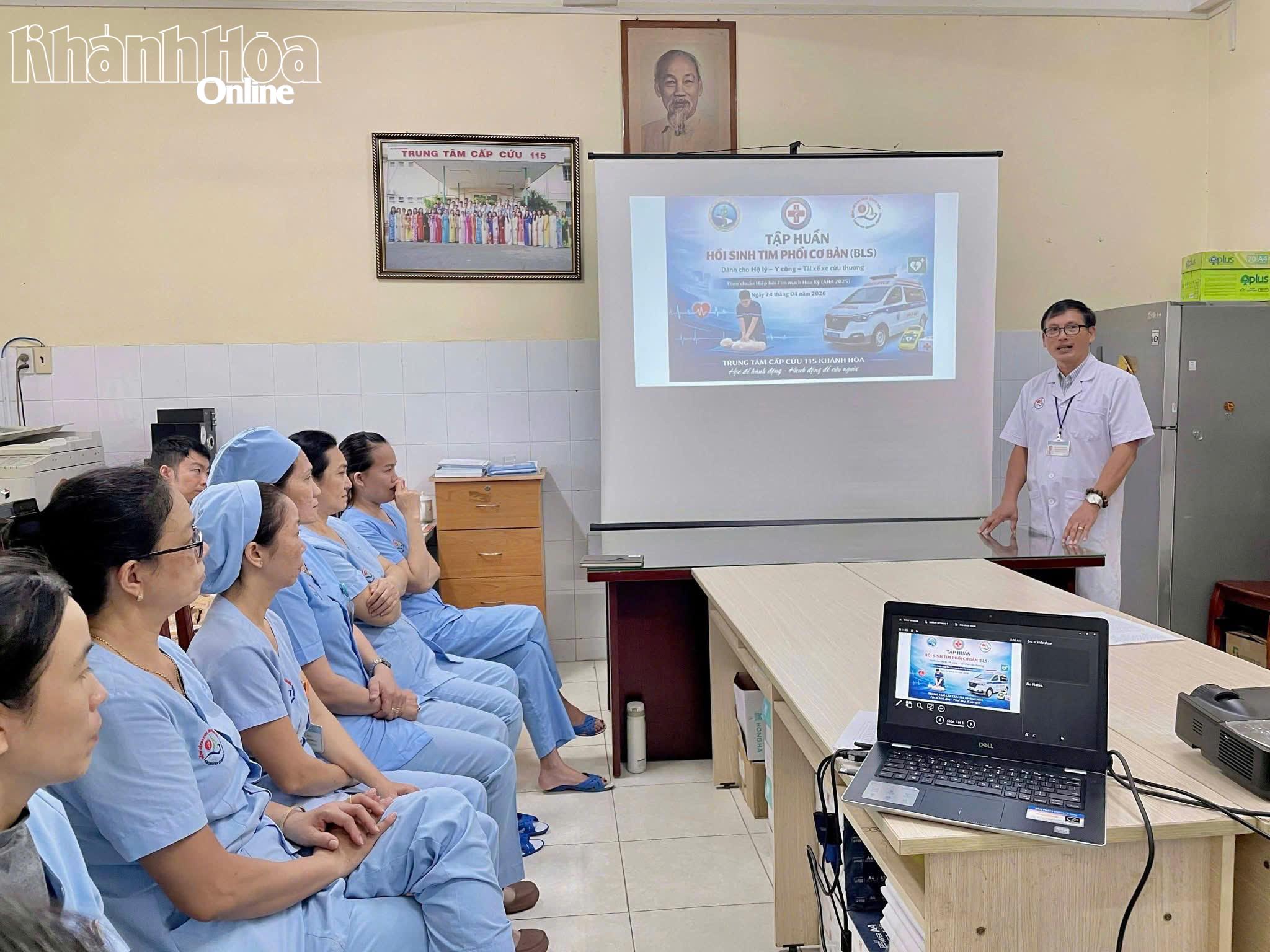 Ngày 24-4, Trung tâm Cấp cứu 115 Khánh Hòa tổ chức lớp tập huấn kỹ năng cấp cứu hồi sinh tim phổi cơ bản cho bệnh nhân bị ngừng tim, ngừng thở do tai nạn, tai nạn đuối nước, tai nạn sinh hoạt, bệnh lý… cho hộ lý và lái xe đang làm việc tại Trung tâm Cấp cứu 115 Khánh Hòa và Khoa Cấp cứu Bệnh viện Đa khoa Khánh Hòa.