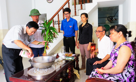 | Lực lượng tổ dân phố Phước Tín 2, phường Phước Long kiểm tra một hộ diệt lăng quăng. |