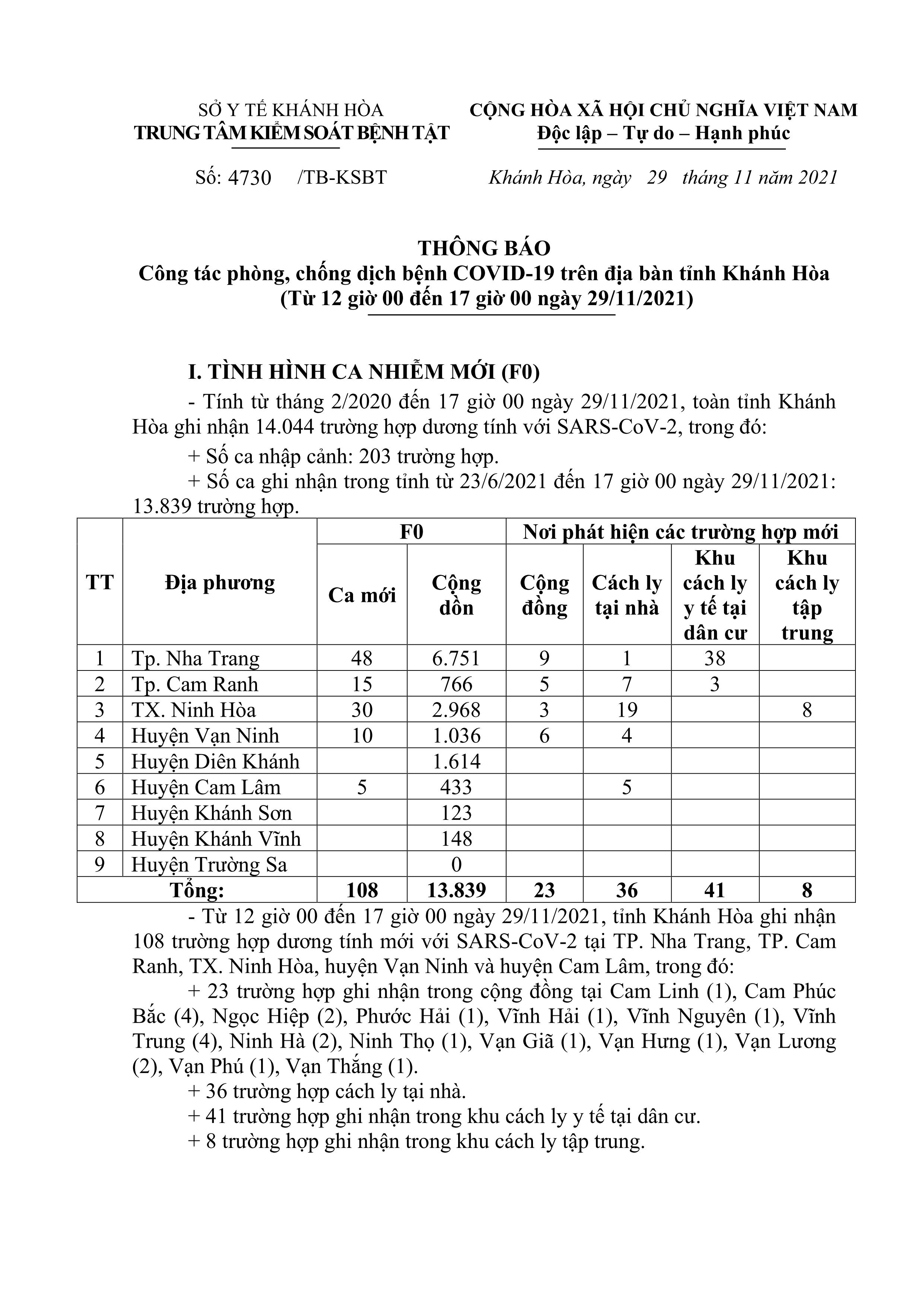 Tính từ ngày 23-6 đến 7 giờ ngày 29-11, tỉnh Khánh Hòa ghi nhận 13.635 ca mắc Covid-19. Trong đó, Nha Trang nhiều nhất với 6.662 ca, Ninh Hòa 2.909 ca, Diên Khánh 1.602 ca, Vạn Ninh 1.024 ca, Cam Ranh 744 ca, Cam Lâm 423 ca, Khánh Vĩnh 148 ca, Khánh Sơn 123 ca. Toàn tỉnh đã truy vết được 19.099 F1 và 17.449 F2; phong tỏa tạm thời 23 địa điểm; lấy 1.043.758 mẫu xét nghiệm PCR và 5.497.144 mẫu test nhanh kháng nguyên. Cũng theo CDC Khánh Hòa, từ ngày 22-7 đến nay, có 99 bệnh nhân tử vong liên quan đến Covid-19.