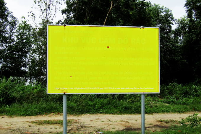 Hiện nay, trên hành lang an toàn đường Đinh Tiên Hoàng (xã Cam Hải Đông, huyện Cam Lâm) có dựng 2 biển cấm đổ rác nhưng đã cũ, phai màu, mờ chữ không còn đọc được (ảnh).