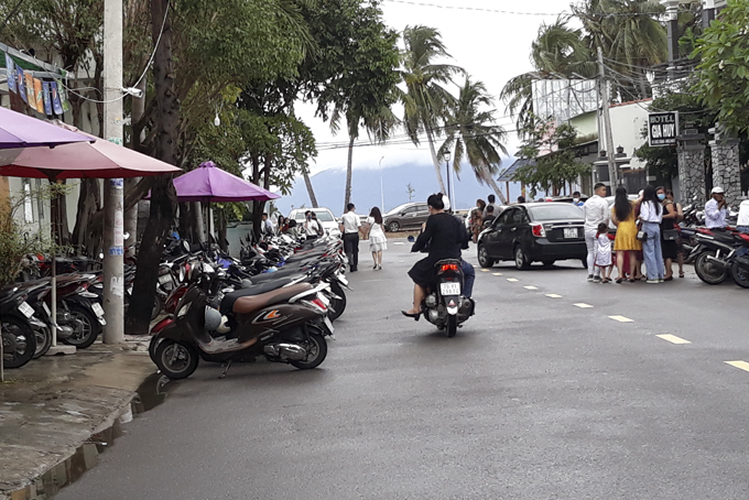 Hàng ngày, trên đường Trần Phú (thị trấn Vạn Giã, huyện Vạn Ninh), một số người kinh doanh quán cà phê, nhà hàng, nước uống… thường xuyên chiếm dụng lòng đường để dựng xe cho khách hàng, gây cản trở giao thông.