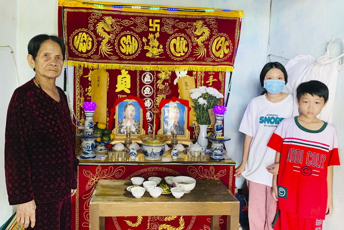 Chị em Trâm Anh, Gia Huy và bà nội bên bàn thờ cha mẹ. |