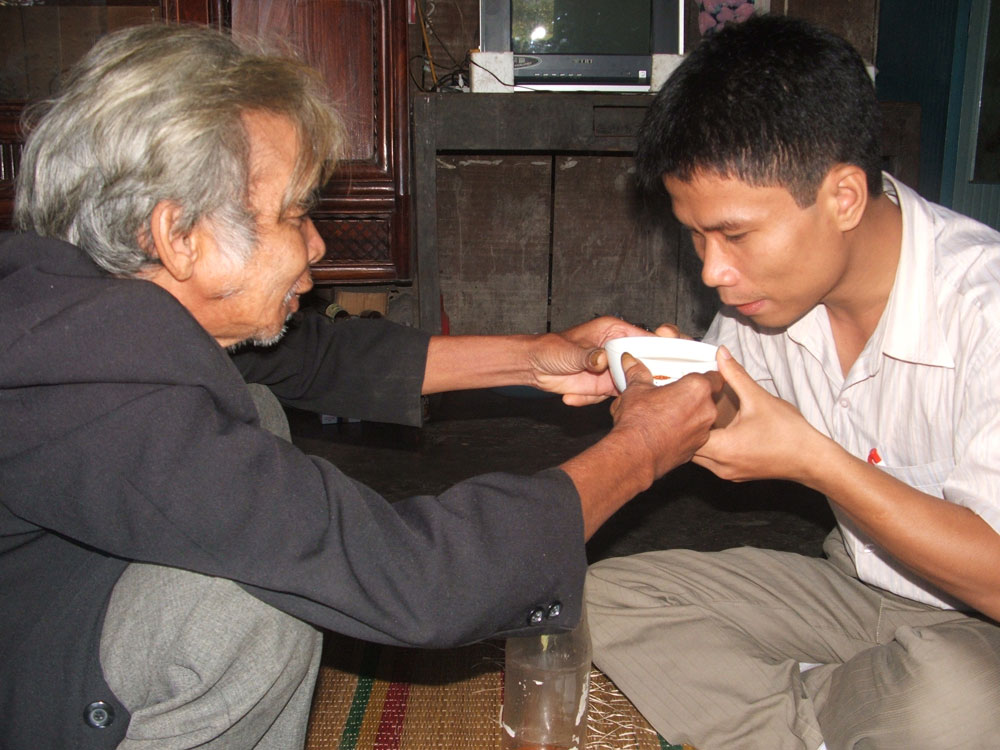 Một ngày gần Tết, chúng tôi theo chân một bậc cao niên đến nhà già làng Tô Hoàng Bang (70 tuổi, người dân tộc Raglai) ở thôn A Thi, xã Ba Cụm Bắc, huyện Khánh Sơn để tìm hiểu về rượu cần, một sản phẩm văn hóa vật chất – tinh thần truyền thống của đồng bào Raglai nơi đây. Già làng Tô Hoàng Bang là một trong rất ít bậc cao niên ở Khánh Sơn hiện vẫn còn bảo lưu được cách làm rượu cần từ những nguyên liệu và phương pháp cổ xưa. Không chỉ vậy, già Bang còn hướng dẫn con cháu và bà con trong làng làm Tapai theo cách truyền thống của dân tộc mình để giữ cho “hồn” Tapai không bị nhạt phai… Có lẽ vì vậy mà khi thấy có người hỏi về rượu cần, già Bang rất vui. Già đi ngay xuống bếp, hút rượu cần từ trong ché ra một ca nhựa, rồi mang lên rót ra bát mời khách thưởng thức. Già Bang bưng bát rượu bằng 2 tay, cẩn thận nâng lên miệng mời chúng tôi uống. Chờ chúng tôi uống cạn, già Bang mới đặt bát xuống. Thấy chúng tôi có vẻ ngạc nhiên, già giải thích: “Tapai rất quý, chỉ trong lễ mới có hoặc chỉ để mời khách quý thôi. Đã là khách quý thì không kể già hay trẻ, chủ nhà vẫn mời khách uống Tapai như vậy”. Và trong lúc nói chuyện, già Bang rất ít khi dùng từ “rượu cần”, chỉ dùng từ “Tapai” theo tiếng của người Raglai.