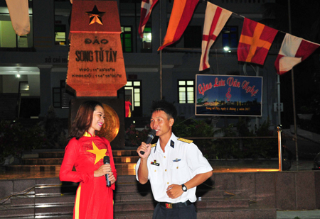 | Đi cùng đoàn công tác còn có các ca sĩ, nghệ sĩ của đoàn ca múa nhạc Hải Đăng đến giao lưu cùng các cán bộ, chiến sĩ trên đảo |