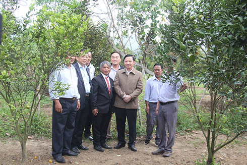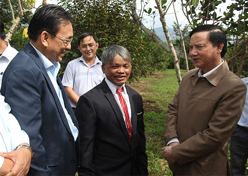 Ngoài ra, ông Nguyễn Khắc Định còn đến thăm mô hình trồng cây ăn quả cho thu nhập cao của hộ ông Cao Hoàng Giáo (hộ đồng bào dân tộc thiểu số Raglai tại xã Sơn Bình). Đây là mô hình trồng cây ăn quả sử dụng nước tưới tiết kiệm. Trên diện tích 7ha, gia đình ông Giáo đã trồng các loại cây ăn quả có giá trị kinh tế cao như: sầu riêng, quýt đường… Hiện nay, quýt đường đang cho thu hoạch, dự kiến năm nay gia đình ông thu hoạch khoảng 50 tấn quýt, cộng với một số diện tích sầu riêng đã cho thu hoạch trước đó, năm nay gia đình ông Cao Hoàng Giáo thu nhập hơn 750 triệu đồng.
