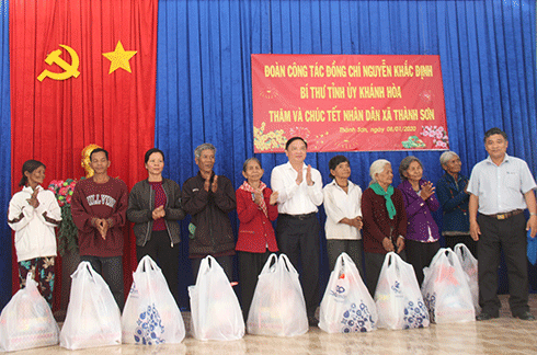 Ngoài ra, Bí thư Tỉnh ủy Nguyễn Khắc Định đã cùng với lãnh đạo các đơn vị giúp đỡ xã Thành Sơn (huyện Khánh Sơn), gồm: Văn Phòng Tỉnh ủy, Công ty Cổ phần Đầu tư VCN, Công ty Cổ phần Nha Trang Seafood F17, Công ty Cổ phần Cảng Nha Trang đã đến thăm, tặng quà Tết cho 609 hộ nghèo tại địa phương này. Bí thư Tỉnh ủy cùng lãnh đạo các đơn vị, doanh nghiệp đã trao mỗi hộ dân phần quà trị giá 314.000 đồng, gồm các nhu yếu phẩm thiết yếu. Ông Nguyễn Khắc Định chia sẻ, đây là tình cảm chân thành của các đơn vị giúp đỡ xã Thành Sơn, nhằm sẻ chia với các hộ nghèo, hộ khó khăn trên địa bàn xã Thành Sơn trong dịp Tết Nguyên đán năm nay.