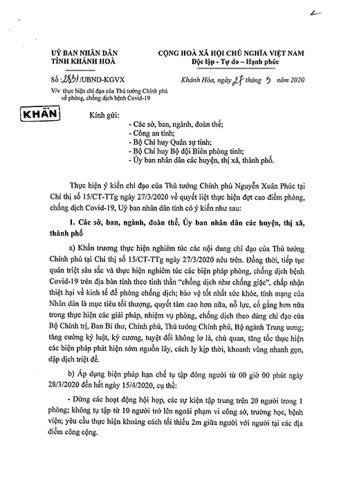 Thực hiện ý kiến chỉ đạo của Thủ tướng Chính phủ Nguyễn Xuân Phúc tại Chỉ thị số 15/CT-TTg ngày 27/3/2020 về quyết liệt thực hiện đợt cao điểm phòng, chống dịch Covid-19, Uỷ ban nhân dân tỉnh có ý kiến như sau: