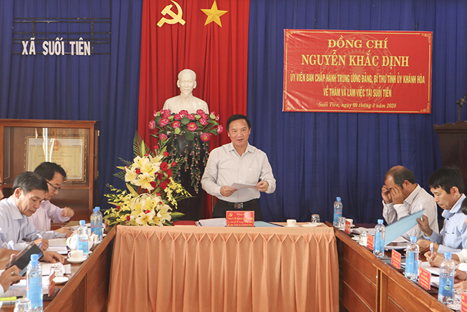 Ngày 10-3, ông Nguyễn Khắc Định - Ủy viên Trung ương Đảng, Bí thư Tỉnh ủy Khánh Hòa có buổi làm việc với Đảng ủy xã Diên Đồng (huyện Diên Khánh) về kết quả kinh tế - xã hội của địa phương năm 2019, nhiệm vụ trọng tâm năm 2020.