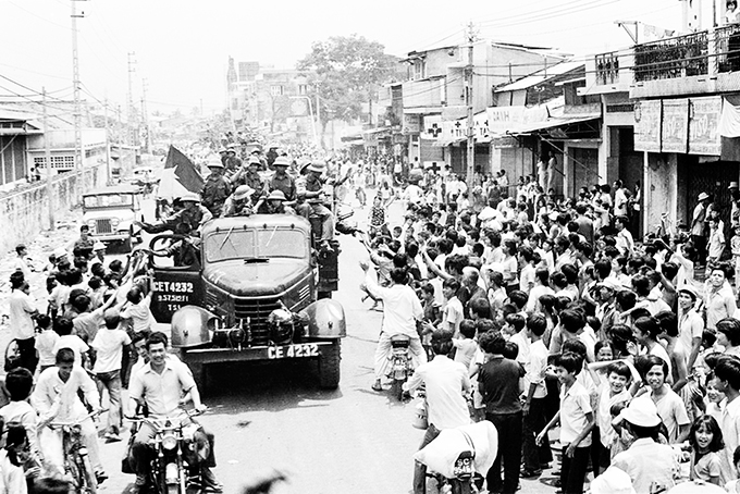 Người dân Sài Gòn chào đón đoàn quân giải phóng. Ảnh tư liệu. |