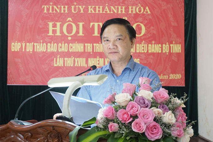 Chiều 18-5, Ban Thường vụ Tỉnh ủy Khánh Hòa tổ chức hội thảo góp ý dự thảo Báo cáo chính trị trình Đại hội Đảng bộ tỉnh lần thứ XVIII. Các ông: Nguyễn Khắc Định - Ủy viên Trung ương Đảng, Bí thư Tỉnh ủy; Nguyễn Khắc Toàn - Ủy viên dự khuyết Trung ương Đảng, Phó Bí thư Thường trực Tỉnh ủy; Nguyễn Tấn Tuân - Phó Bí thư Tỉnh ủy, Chủ tịch UBND tỉnh; Hà Quốc Trị - Phó Bí thư Tỉnh ủy chủ trì hội nghị. Dự hội thảo có Phó Giáo sư, Tiến sĩ Trần Đình Thiên - nguyên Viện trưởng Viện Kinh tế Việt Nam, thành viên Tổ tư vấn kinh tế của Thủ tướng Chính phủ; Phó Giáo sư, Tiến sĩ Bùi Văn Huyền - Viện trưởng Viện Kinh tế, Học viện Chính trị quốc gia Hồ Chí Minh, Ủy viên Hội đồng lý luận Trung ương; nhiều nhà khoa học các viện, trường trên địa bàn.
