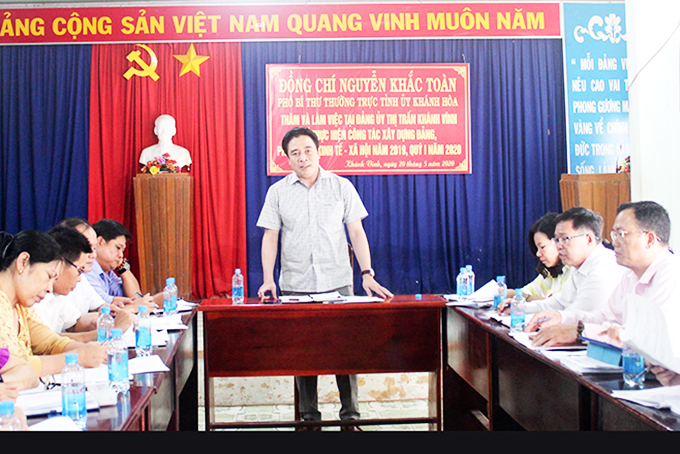 Ngày 20-5, ông Nguyễn Khắc Toàn - Ủy viên dự khuyết Trung ương Đảng, Phó Bí thư Thường trực Tỉnh ủy Khánh Hòa làm việc với Đảng ủy thị trấn Khánh Vĩnh, huyện Khánh Vĩnh về thực hiện công tác xây dựng Đảng, phát triển kinh tế - xã hội năm 2019, quý I/2020 và phương hướng nhiệm vụ những tháng còn lại trong năm.