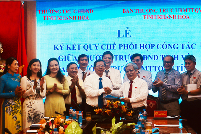 Chiều 1-7, HĐND tỉnh Khánh Hòa tổ chức lễ ký kết Quy chế phối hợp công tác giữa Thường trực HĐND tỉnh với Ban Thường trực UBMTTQ Việt Nam tỉnh. Các ông: Lê Xuân Thân - Trưởng đoàn Đại biểu Quốc hội tỉnh - Phó Chủ tịch HĐND tỉnh; Trần Ngọc Thanh - Trưởng ban Dân vận Tỉnh ủy, Chủ tịch UBMTTQ Việt Nam tỉnh chủ trì.