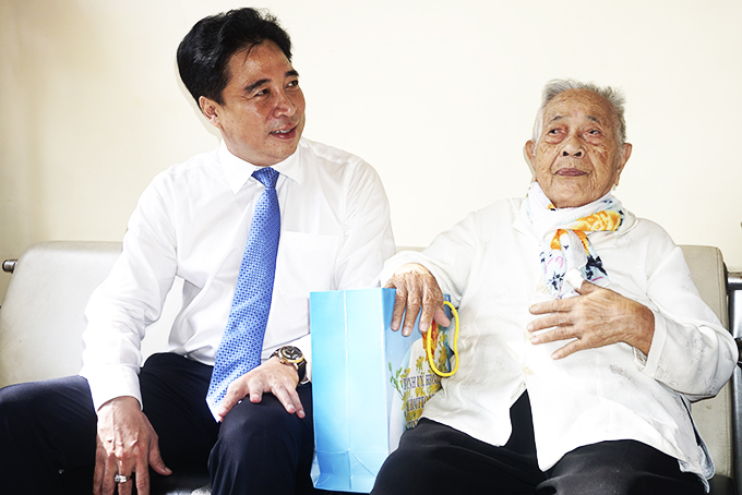 Ông Nguyễn Khắc Toàn thăm hỏi và tặng quà cho bà Phạm Thị Xuyến. |
