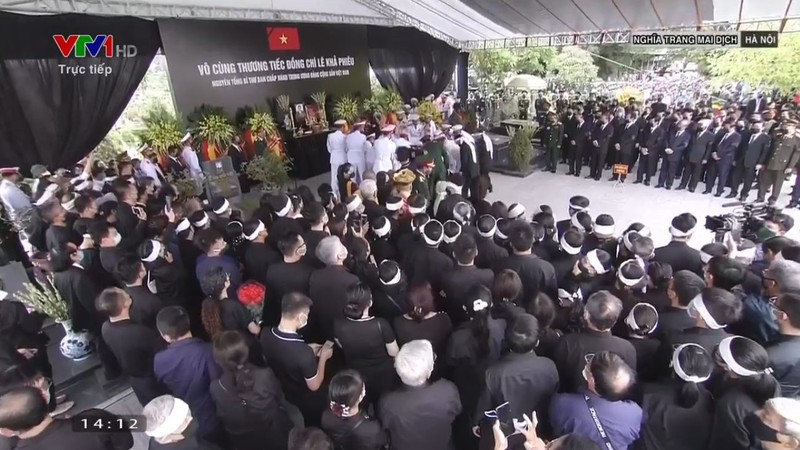Sau các nghi thức truyền thống, các đồng chí lãnh đạo, nguyên lãnh đạo Đảng, Nhà nước, Mặt trận Tổ quốc Việt Nam, gia quyến của nguyên Tổng Bí thư Lê Khả Phiêu đã thả hoa, đi quanh phần mộ, tiễn biệt ông lần cuối.