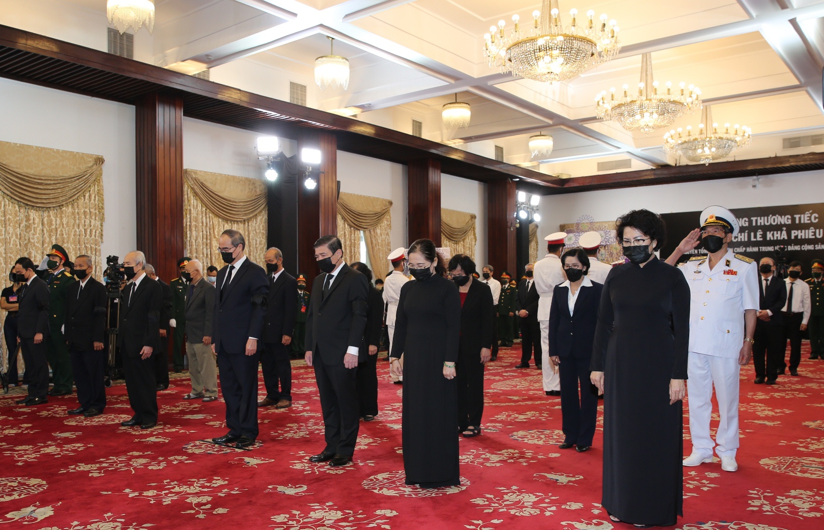 Đoàn đại biểu Thành ủy - HĐND - UBND - Ủy ban MTTQ Việt Nam TPHCM do Ủy viên Bộ Chính trị, Bí thư Thành ủy TPHCM Nguyễn Thiện Nhân làm Trưởng đoàn vào viếng đồng chí Lê Khả Phiêu tại Hội trường Thống Nhất. Ảnh: VGP/Mạnh Hùng