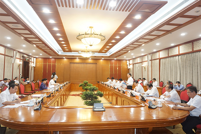 Đoàn công tác của tỉnh Khánh Hòa tham dự buổi làm việc có các ông: Nguyễn Khắc Định - Ủy viên Trung ương Đảng, Bí thư Tỉnh ủy; Nguyễn Khắc Toàn - Ủy viên dự khuyết Trung ương Đảng, Phó Bí thư Thường trực Tỉnh ủy; Nguyễn Tấn Tuân - Phó Bí thư Tỉnh ủy, Chủ tịch UBND tỉnh; Hà Quốc Trị - Phó Bí thư Tỉnh ủy; Hồ Văn Mừng - Ủy viên Ban Thường vụ Tỉnh ủy, Trưởng ban Tuyên giáo Tỉnh ủy; Nguyễn Văn Ghi - Ủy viên Ban Thường vụ Tỉnh ủy, Chủ nhiệm Ủy ban Kiểm tra Tỉnh ủy…
