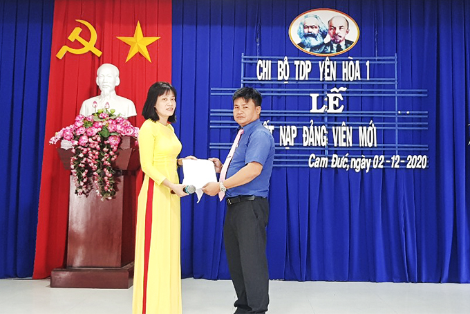 Lễ kết nạp đảng viên mới ở Chi bộ tổ dân phố Yên Hòa 1, thị trấn Cam Đức, huyện Cam Lâm (năm 2020). Ảnh: Lê Huế |