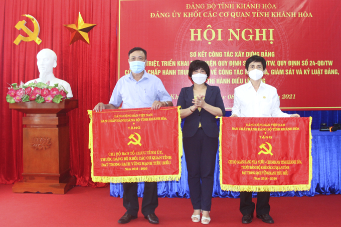 Nhân dịp này, Ban Thường vụ Tỉnh ủy đã tặng cờ cho 2 tổ chức cơ sở đảng đạt tiêu chuẩn “Trong sạch, vững mạnh” tiêu biểu 5 năm liền (2016-2020) là Chi bộ Ban Tổ chức Tỉnh ủy và Chi bộ Ngân hàng Nhà nước Chi nhánh Khánh Hòa; tặng bằng khen cho 11 đảng viên đạt tiêu chuẩn “Hoàn thành xuất sắc nhiệm vụ” 5 năm liền (2016-2020).