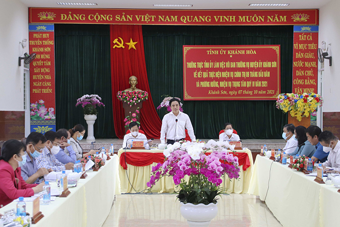 Sáng 7-10, Thường trực Tỉnh ủy Khánh Hòa làm việc với Ban Thường vụ Huyện ủy Khánh Sơn về kết quả thực hiện nhiệm vụ 9 tháng năm 2021. Các ông: Nguyễn Khắc Toàn - Phó Bí thư Thường trực Tỉnh ủy, Chủ tịch HĐND tỉnh; Nguyễn Tấn Tuân - Phó Bí thư Tỉnh ủy, Chủ tịch UBND tỉnh; Hà Quốc Trị - Phó Bí thư Tỉnh ủy, Trưởng đoàn Đại biểu Quốc hội tỉnh cùng chủ trì buổi làm việc.