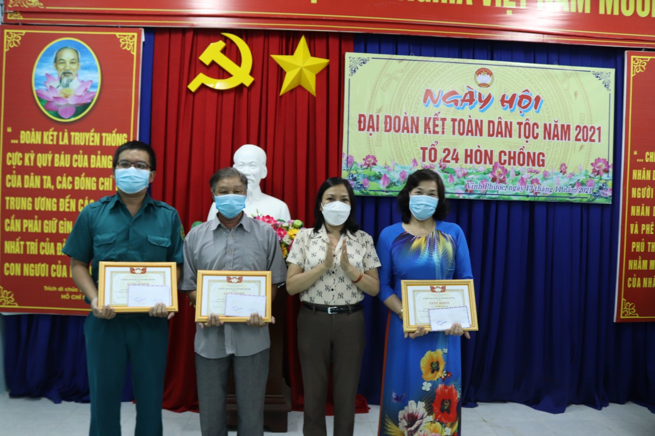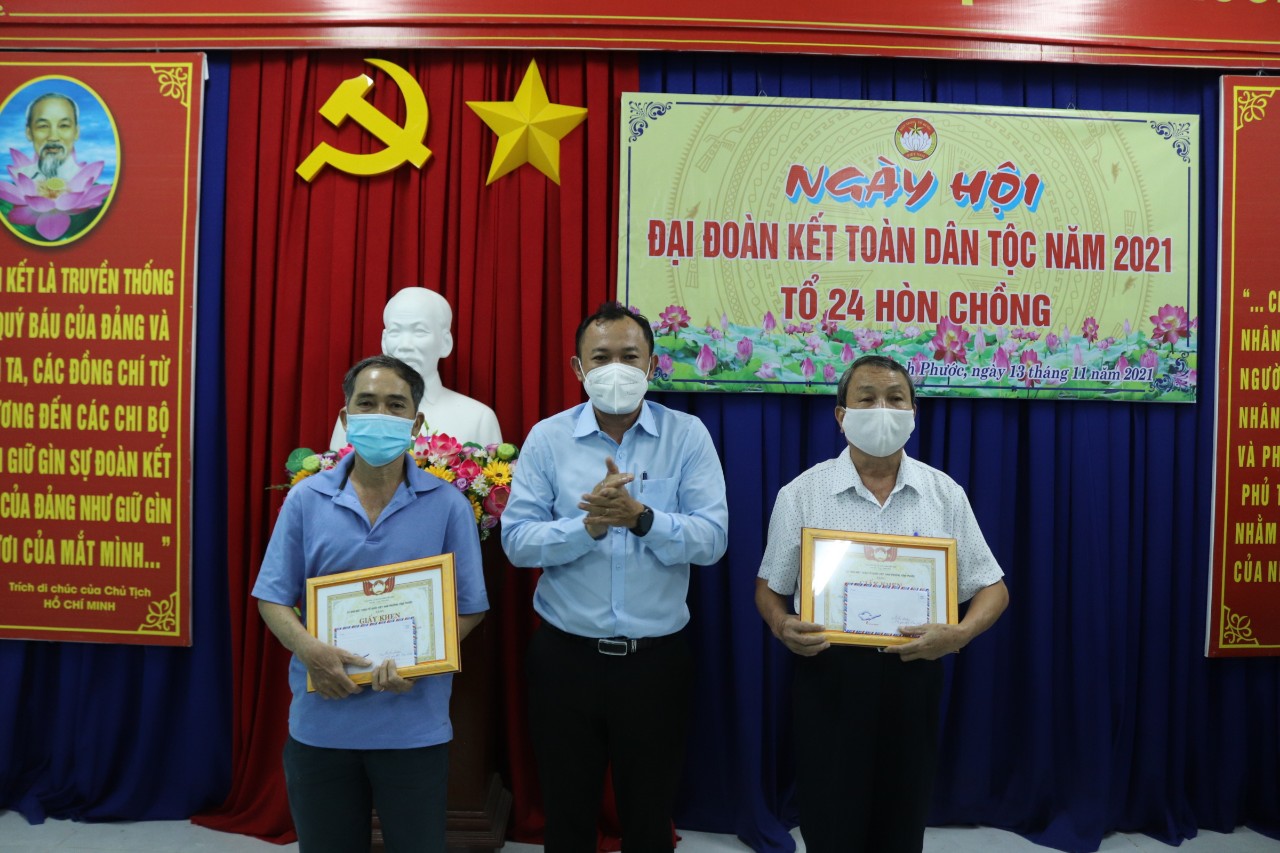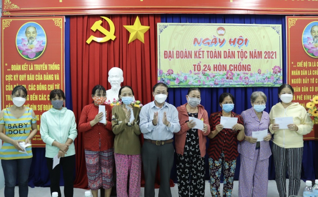 Nhân dịp này, UBMTTQ Việt Nam tỉnh đã trao 20 phần quà cho các gia đình nghèo, khó khăn do ảnh hưởng dịch Covid-19 tại KDC, mỗi phần quà trị giá 500.000 đồng từ nguồn Quỹ Vì người nghèo tỉnh. Đồng thời, UBMTTQ Việt Nam phường Vĩnh Phước tặng giấy khen và quà cho 2 hộ gia đình tiêu biểu thực hiện Cuộc vận động “Toàn dân đoàn kết xây dựng nông thôn mới, đô thị văn minh và công tác phòng chống dịch Covid-19”; 3 cá nhân có thành tích tiêu biểu trong công tác phòng, chống dịch Covid-19.
