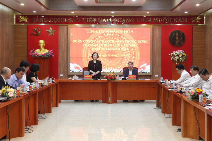 Sáng 8-12, đoàn công tác của Ban Chỉ đạo Trung ương về quản lý biên chế do bà Phạm Thị Thanh Trà - Ủy viên Trung ương Đảng, Phó Trưởng ban Tổ chức Trung ương, Bộ trưởng Bộ Nội vụ làm trưởng đoàn làm việc với Ban Thường vụ Tỉnh ủy Khánh Hòa. Làm việc với đoàn có các ông: Nguyễn Hải Ninh - Ủy viên Trung ương Đảng, Bí thư Tỉnh ủy; Nguyễn Khắc Toàn - Phó Bí thư Thường trực Tỉnh ủy, Chủ tịch HĐND tỉnh; Nguyễn Tấn Tuân - Phó Bí thư Tỉnh ủy, Chủ tịch UBND tỉnh; Hà Quốc Trị - Phó Bí thư Tỉnh ủy, Trưởng đoàn Đại biểu Quốc hội tỉnh; các vị trong Ban Thường vụ Tỉnh ủy và đại diện sở, ngành, đơn vị liên quan.