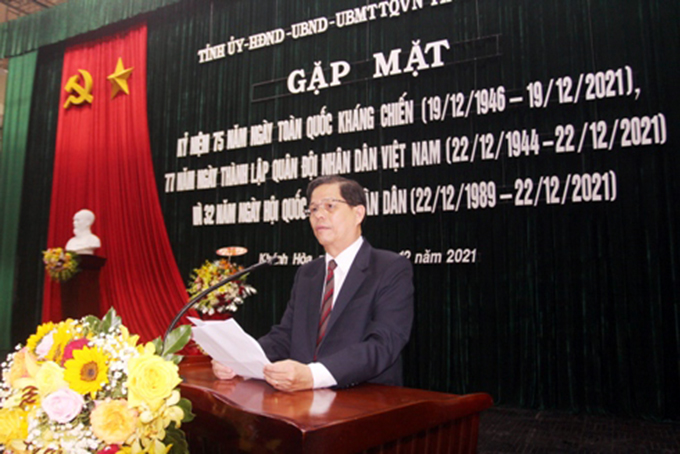 Ngày 21-12, Tỉnh ủy, HĐND, UBND, UBMTTQ Việt Nam tỉnh Khánh Hòa tổ chức gặp mặt hơn 650 cán bộ cấp cao quân đội đã nghỉ hưu trên địa bàn tỉnh nhân kỷ niệm 77 năm Ngày thành lập Quân đội nhân dân Việt Nam (22-12-1944 - 22-12-2021) và 32 năm Ngày hội Quốc phòng toàn dân (22-12-1989 - 22-12-2021). Đến dự buổi gặp mặt có các ông: Nguyễn Tấn Tuân - Phó Bí thư Tỉnh ủy, Chủ tịch UBND tỉnh; Hà Quốc Trị - Phó Bí thư Tỉnh ủy, Trưởng đoàn Đại biểu Quốc hội tỉnh; Trần Ngọc Thanh - Chủ tịch UBMTTQ Việt Nam tỉnh, Trưởng ban Dân vận Tỉnh ủy; Phạm Thị Xuân Trang - Phó Chủ tịch HĐND tỉnh.