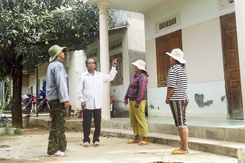 Ông Dân (áo trắng) nói chuyện với người dân trong thôn. |