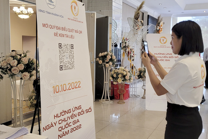 Đại biểu quét mã QR để nhận tài liệu chương trình hưởng ứng Ngày Chuyển đổi số quốc gia. |