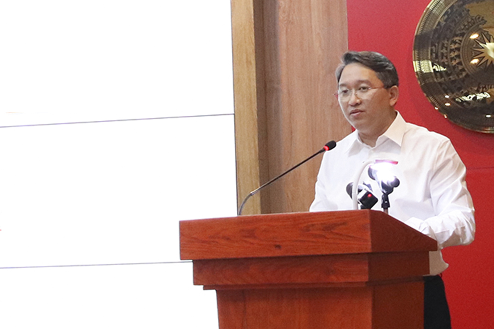 Ông Nguyễn Tấn Tuân báo cáo tình hình phát triển kinh tế - xã hội của tỉnh.
