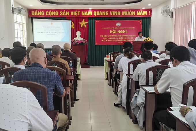 Chiều 23-9, Ủy ban MTTQ Việt Nam tỉnh Khánh Hòa tổ chức hội nghị phổ biến, tuyên truyền Nghị quyết số 55, ngày 16-6-2022 của Quốc hội khóa XV về thí điểm một số cơ chế, chính sách đặc thù phát triển tỉnh Khánh Hòa cho hơn 100 vị chức sắc, chức việc, nhà tu hành, người uy tín trong các tôn giáo trên địa bàn tỉnh.