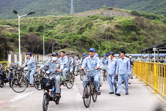 Công nhân của Công ty TNHH Đóng tàu Hyundai Việt Nam đi xe đạp đến phân khu làm việc. |