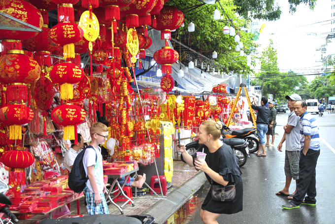 Người dân, du khách đến xem, mua sắm đồ trang trí Tết. |