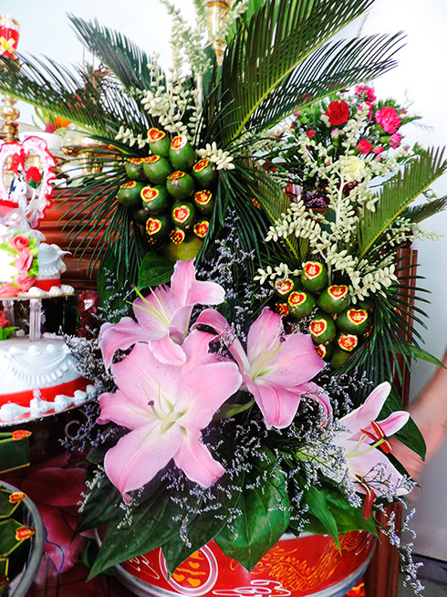 Ngôi nhà của cụ bà Nguyễn Thị Kiều (75 tuổi, thôn Vĩnh Cát, xã Suối Hiệp) nổi bật không chỉ nhờ vào sự mộc mạc, cũ kỹ với gần 100 năm tuổi mà còn vì hàng cau xưa thẳng tắp trước ngõ. Ngồi bên chái hiên ngôi nhà, bà Kiều chậm rãi kể về ký ức xưa khi Tết đến xuân về, bên cạnh việc chuẩn bị mâm ngũ quả, bánh mứt trên bàn thờ gia tiên, con cháu trong nhà còn phải chú tâm chọn những buồng cau đẹp, lá trầu xanh mướt trong vườn. Một phần để bày biện trên mâm cúng tổ tiên, một phần để tiếp khách. Lúc đó, các cụ ông thường ngồi bàn trà đàm đạo, các cụ bà lại quây quần bên cơi trầu trò chuyện. “Thời nay, có nhiều loại cau cảnh với màu sắc, hình dáng khác nhau nhưng tôi vẫn nhắn nhủ con cháu giữ lại hàng cau xưa. Loài cau có thân cây nhỏ nhưng vươn cao, hiên ngang trong gió như hồn cốt, tinh thần của người dân Việt Nam từ ngàn xưa”, bà Kiều trầm ngâm.