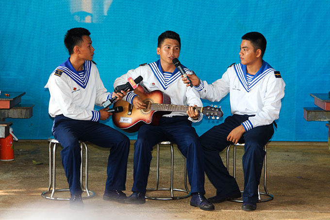 Lính trẻ vui đàn hát. Ảnh: Phú Quốc |