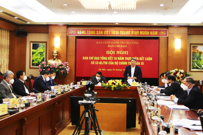 Ông Nguyễn Hải Ninh phát biểu tại Hội nghị Ban Chỉ đạo xây dựng Đề án tổng kết 10 năm thực hiện Kết luận 53 của Bộ Chính trị. |