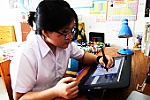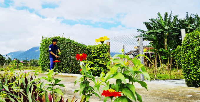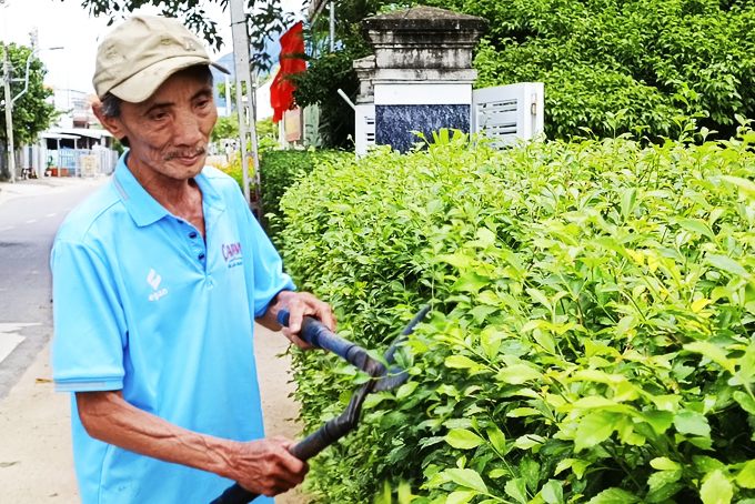 Ông Đỗ Bá Khánh cắt tỉa, chăm chút hàng rào xanh trước nhà. |