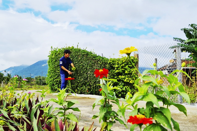 Phong cảnh phía trước nhà ông Nguyễn Long rất đẹp mắt với hàng rào xanh và nhiều loại hoa khoe sắc. |