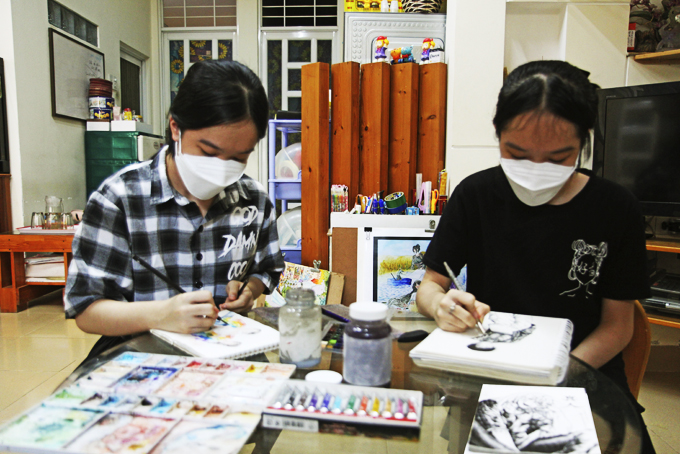Chị em sinh đôi Ngô Lê Thanh Phương và Ngô Lê Minh Phương (lớp 9/2 Trường THCS Lý Thái Tổ) sống trong ngôi nhà yên bình với nhiều giỏ cây xanh ở phường Vĩnh Hòa (TP. Nha Trang). Hai em có dáng người nhỏ nhắn, rụt rè với người lạ nhưng luôn quấn quýt bên nhau và cùng chung niềm say mê hội họa. Thanh Phương có thể ngồi hàng giờ xem em phác nhanh từng nét chì, hay tô những nét li ti tạo khối cho chân dung. Còn Minh Phương thích nhìn chị “đi” từng vệt màu khỏe khoắn trên giấy… Ông Ngô Văn Thành, ba của hai em kể, Thanh Phương thường giặt, ủi, gấp từng bộ quần áo cũ cho vào túi ni-lông để ba mang đi ủng hộ các bạn khó khăn. Còn Minh Phương từng rất ấn tượng cách làm ra những hạt muối óng ánh lúc được ba dẫn đi xem triển lãm ngành nghề tại Bảo tàng tỉnh. Nhưng ông không nghĩ có ngày hai con thể hiện những điều đó vào tranh…