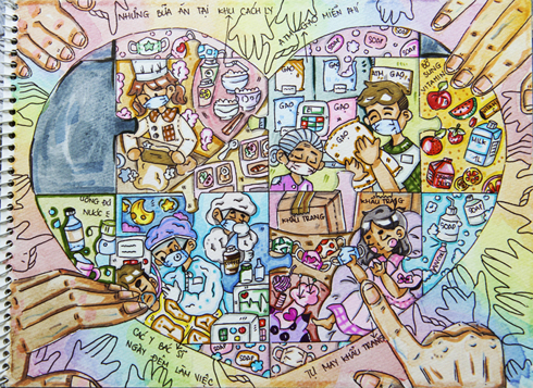 Gia đình Nguyễn Trần Pha Lê (lớp 10D1, Trường THPT Lý Tự Trọng) ở trong con hẻm nhỏ đường Quang Trung. Giữa chộn rộn phố phường ngày cuối năm, em vẫn cặm cụi hoàn thành một bản vẽ điện tử cho bộ truyện tranh về môi trường. Phòng riêng của em như xưởng hội họa với các tác phẩm về đại dịch Covid-19, về môi trường và các nhân vật hoạt hình. Các bức tranh sắc sảo trong từng nét vẽ, trong trẻo trong tạo hình nhân vật và chứa đựng suy tư của người trưởng thành.