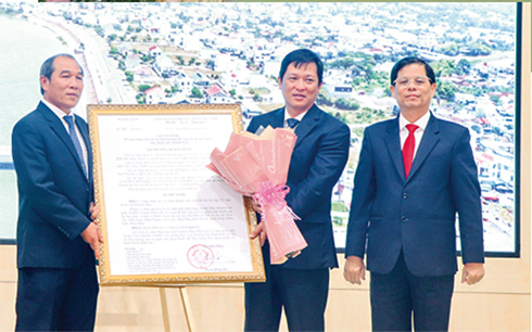 Ông Nguyễn Tấn Tuân - Phó Bí thư Tỉnh ủy, Chủ tịch UBND tỉnh trao Quyết định công nhận đô thị Diên Khánh đạt tiêu chí đô thị loại IV cho lãnh đạo huyện Diên Khánh. |