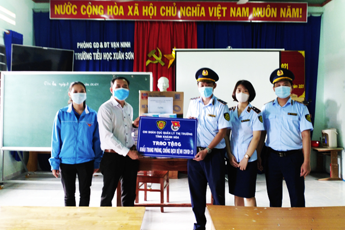 Lực lượng quản lý thị trường tỉnh trao khẩu trang y tế cho Trường Tiểu học Xuân Sơn (huyện Vạn Ninh). |