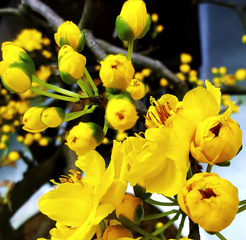Gần Tết, người ta lặt lá, hoa nở bung vàng thật ngỡ ngàng. Hoa kéo dài đến rằm, khi ấy kèn hồng ra hoa sớm, nhìn lên cao một khoảng trời hồng thắm bởi hoa, bên dưới hàng mai vàng thấp chạy dài, dễ thương chi lạ. Người xe ôm nói với tôi, hàng cây mai này có mười năm nay rồi, Tết nào cũng nở hoa vàng rực.