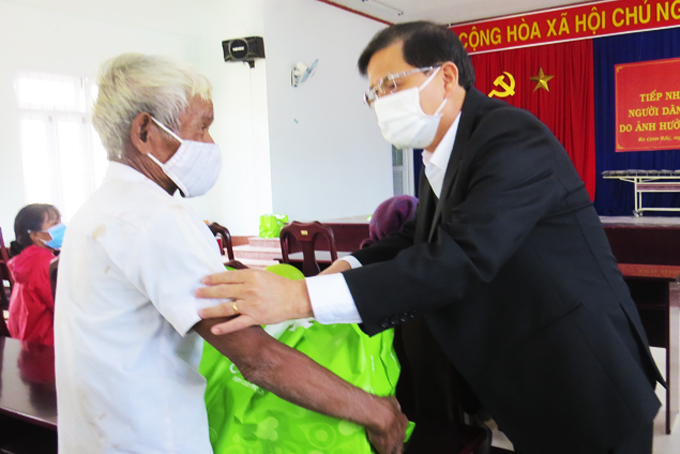 Ông Nguyễn Tấn Tuân trao túi an sinh cho người dân xã Ba Cụm Bắc. |