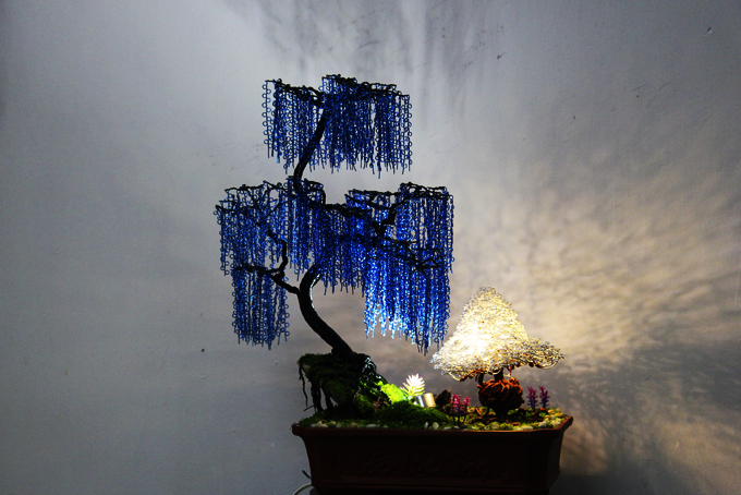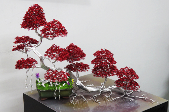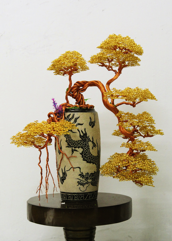 Lúc đầu, dây đồng mua về, ông loay hoay gần chục ngày mà chẳng nên cơm cháo gì. Cây thế đầu tiên rốt cuộc cũng định hình nhưng dáng khá cứng. Những chi tiết nhỏ uốn cũng rất đau tay. Làm đi làm lại hàng chục lần, mất hàng triệu đồng “học phí”, ông đã rút ra kinh nghiệm. Dây nhôm phủ sơn tĩnh điện màu mềm dẻo, dễ uốn hơn dây đồng. Tạo hình cây từ đế lên gốc, cành, tán dễ hơn làm ngược lại. Nếu làm từ trên xuống, phải uốn xong toàn bộ tán cây mới ghép được xuống cành, thân, nhưng rất dễ vướng tay…